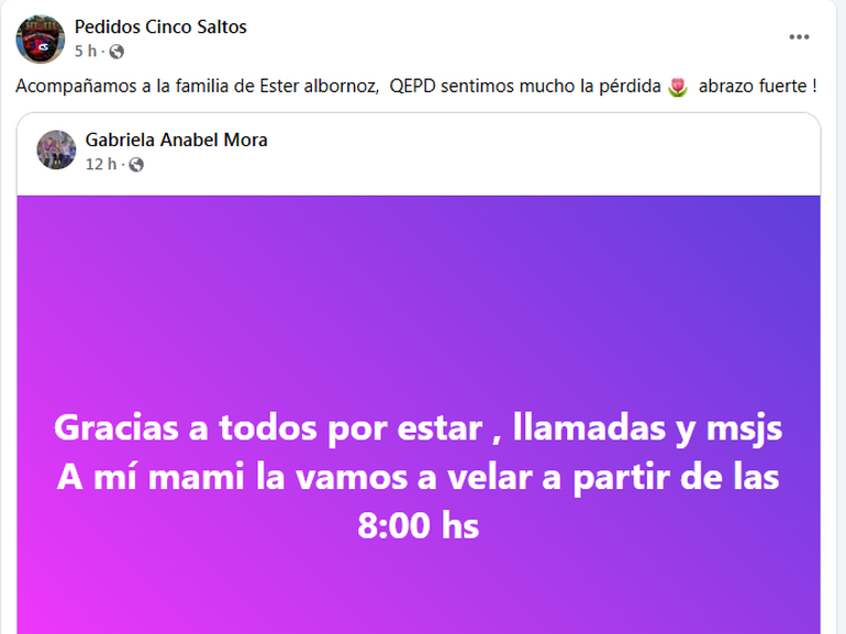 "Gracias a todos por estar", expresó una de sus hijas, Gabriela, quien confirmó que la víctima era su mamá ante los múltiples mensajes que circulaban en redes sociales tras el accidente, que se produjo el domingo por la noche.
