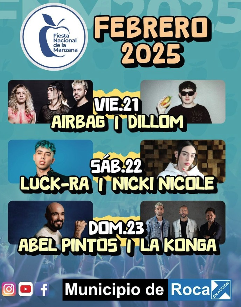 El viernes 21, sábado 22 y domingo 23 de febrero de 2025 se realizará en Roca una nueva edición de la Fiesta Nacional de la Manzana. La tradicional celebración del fin de la cosecha tendrá lugar este año en el nuevo Predio Ferial Municipal donde además de disfrutar de los mejores artistas nacionales y regionales, el público podrá participar de concursos y eventos recreativos.