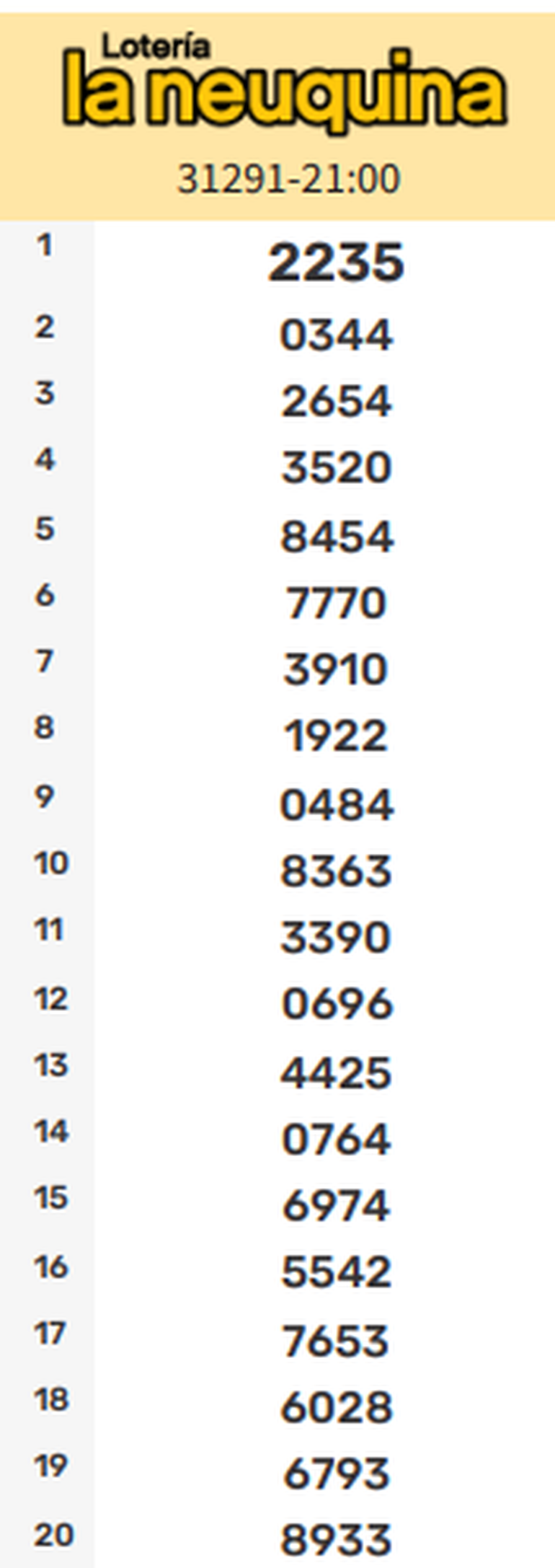Cerrando la jornada de sorteos, la edición Nocturna arrojó como principal favorecido al número 2235. A continuación, el detalle de los 20 premios: