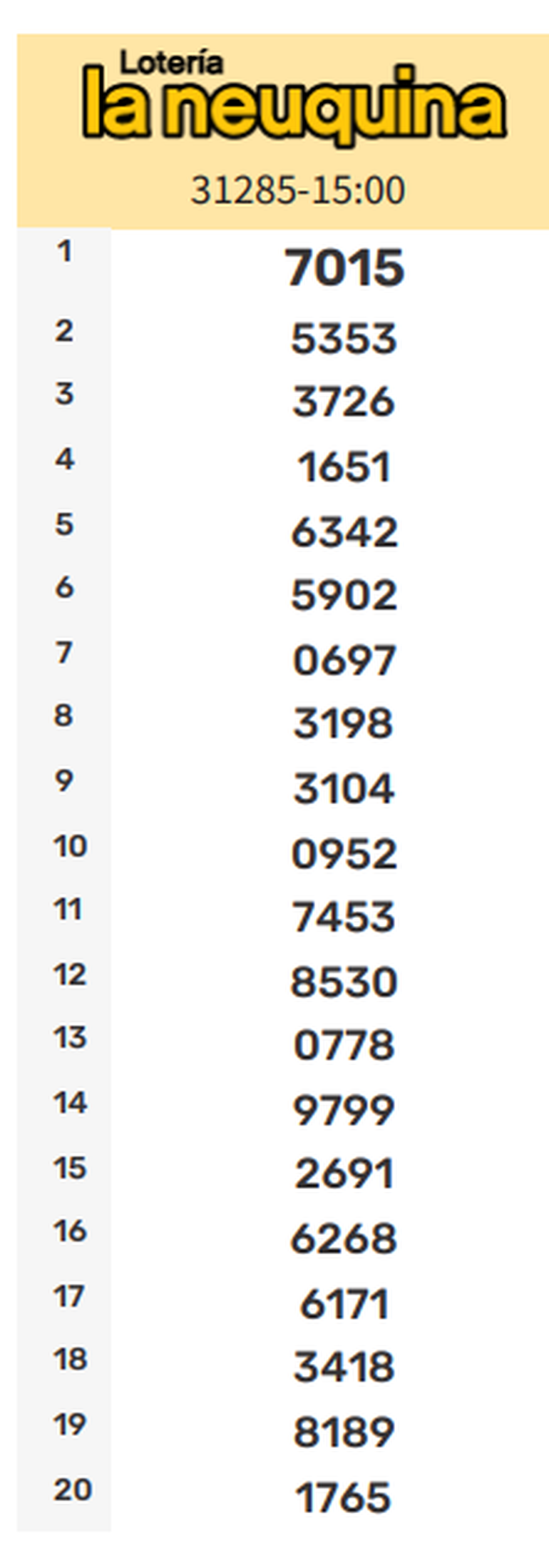 En la edición Matutina, el primer premio correspondió al número 7015, completando la grilla de la siguiente manera: