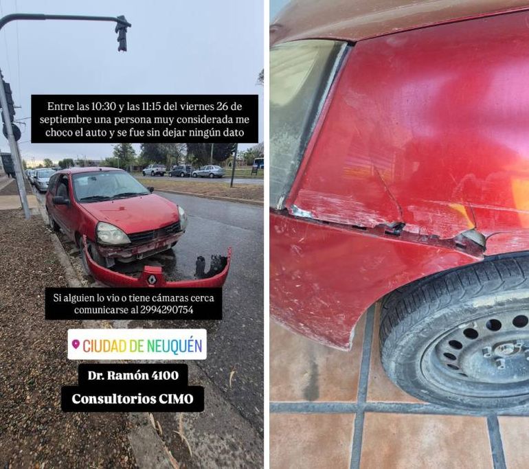 En diálogo con LMNeuquén, contó que su madre bajó a los consultorios CIMO Salud por un turno de kinesiología y, al regresar, encontró el paragolpes totalmente desprendido en el piso. "En realidad, cuando vuelve, se sube el auto y no se dio cuenta. La gente le avisa que se le había caído todo el paragolpe. Es decir, al llegar ya estaba en el piso como en la foto y empezamos a preguntar", dijo Berrogain.