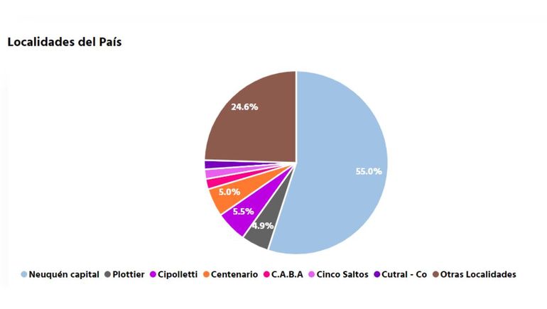 En relación a las ciudades, Neuquén capital ocupa el mayor lugar, con un 55%. Le sigue Cipolletti, con un 5,5%, Centenario, con el 5% Plottier, con 4,9% y la ciudad de Buenos Aires, con un 1,8%. El resto, se divide entre otras localidades del país.