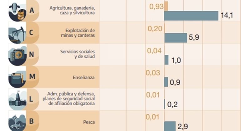 En marzo, con relación al mismo mes de 2023, seis sectores de actividad que conforman el EMAE registraron subas. Se destacaron Agricultura, ganadería, caza y silvicultura (+14,1% ia) y Explotación de minas y canteras (5,9% ia). Las dos ramas fueron las que más incidencia positiva tuvieron sobre el EMAE, que fue arrastrado al fondo del mar por caídas notables en sectores clave.