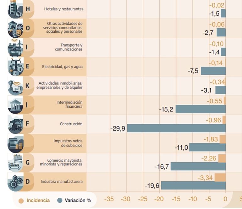 Nueve ramas de actividad registraron caídas en la comparación interanual, entre los que se destacan Construcción (-29,9% ia) e Industria manufacturera (-19,6% ia). Esas dos ramas junto con Comercio mayorista, minorista y reparaciones (-16,7% ia) aportan 6,6 puntos porcentuales a la caída interanual del EMAE (-8,4%), precisó el Indec.