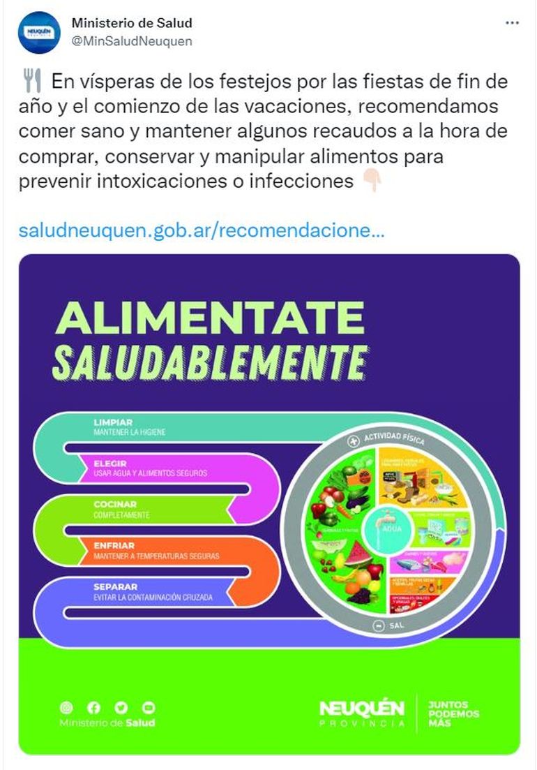 Fomentar la alimentación saludable y la creación de entornos que promuevan la buena salud y faciliten la elección y adopción de prácticas alimenticias y nutricionales saludables es parte de las políticas públicas promovidas por el ministerio de Salud de la provincia. En vísperas de los festejos por las fiestas de fin de año y el comienzo de las vacaciones, se recomienda comer sano, evitando caer en excesos, y mantener algunos recaudos a la hora de comprar, conservar y manipular alimentos para prevenir enfermedades, como intoxicaciones o infecciones.