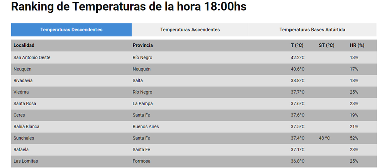 El primer lugar del ranking estuvo liderado por San Antonio Oeste, localidad rionegrina en la que la temperatura ascendió hasta los 42.2°C, también a las 18.
