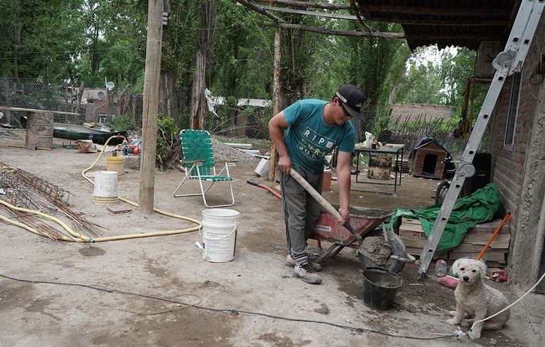 A orillas de un río caudaloso como el Limay, ellos no tienen agua potable. Algunos compran agua en bidones, pero no reciben visitas de los camiones cisterna del Estado. Tamara y Joan, su pareja, accedieron al Plan Mi Pieza de ANSES y compraron varios pallets de ladrillos huecos. A media mañana y con la cumbia vibrando en toda la cuadra, él construye una pieza arriba de su vivienda sin perder la buena energía. "La casa nos quedó chica", dice sobre la planta baja, que ahora convirtieron en un almacén bajo el comando de ella.