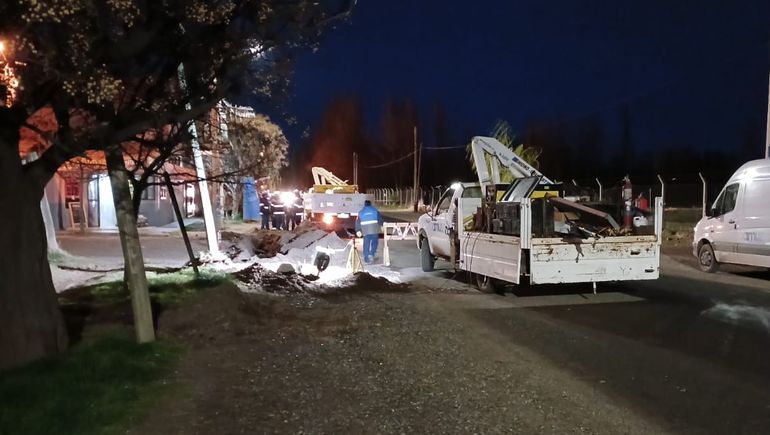 La cuadrilla de Camuzzi trabajó varias horas enfrente de la pista de aterrizaje, por lo que el tránsito por la calle Río Colorado estuvo cortado por precaución.