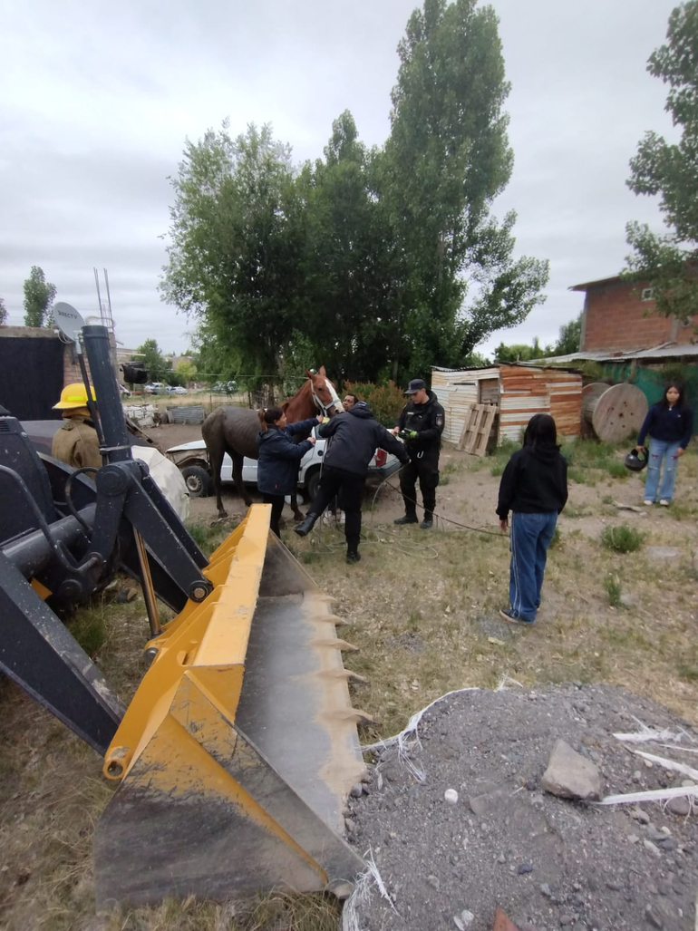 Una labor en conjunto entre la División Bomberos de Zapala y Defensa Civil del Municipio local facilitó el rescate de un caballo que se había caído adentro de un pozo ciego de unos 4 metros de profundidad.