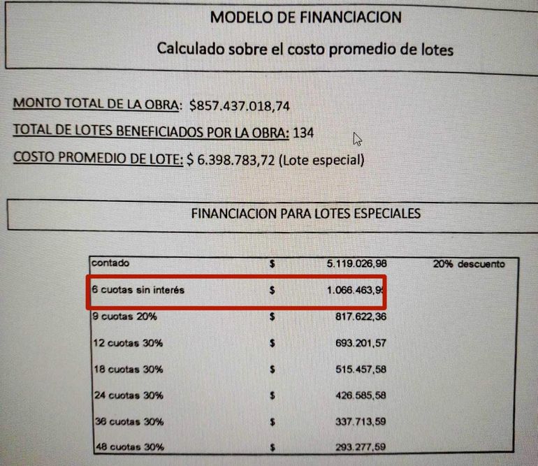 Es que de acuerdo al plan de financiación del asfalto, los vecinos iban a tener un 20% de descuento por el pago contado del asfalto, que si bien revaloriza las propiedades, puede ser caro para cualquier bolsillo. En ese caso, para el pago único al contado, el valor propuesto fue de 5.119.023 pesos.