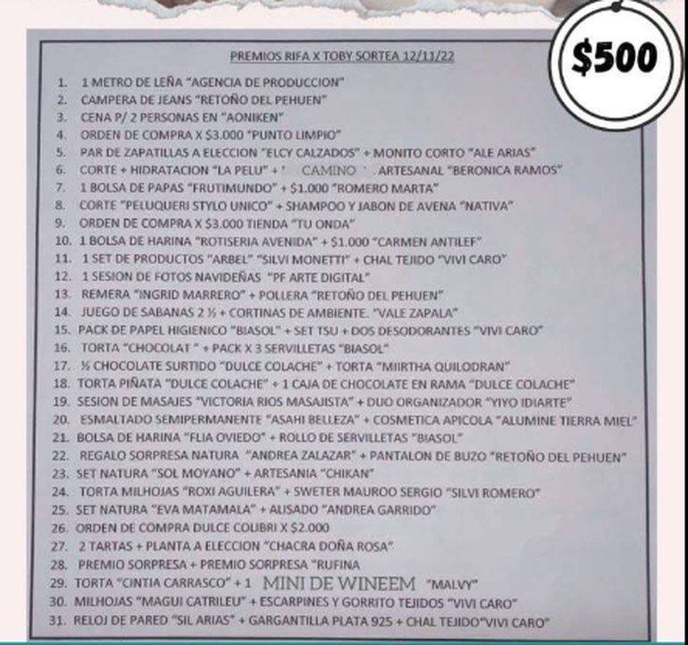 La rifa cuesta $500. Entregará 31 premios muy variados y será sorteada el 12 de noviembre mediante un vivo en el perfil de Facebook de Mariel Temi, donde también se publican los comprobantes de transferencias realizadas y la cantidad de dinero que se va recaudando. Quienes deseen adquirir un número o colaborar se pueden comunicar por la mencionada red social.