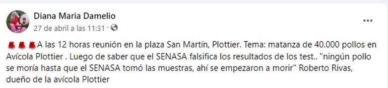 Incluso la intendenta de la localidad Gloria Ruiz empatizó con los productores y expresó: "La primera decisión es sacrificarlas. Pero hay otra tanda de aves que no están enfermas. Se entiende a los productores. Senasa tiene un protocolo. Calculo que deberá hacer los análisis antes de proceder con el sacrificio de otra tanda. Pero hay que buscar otra alternativa. Si no están enfermas no veo por qué hay que sacrificarlas".