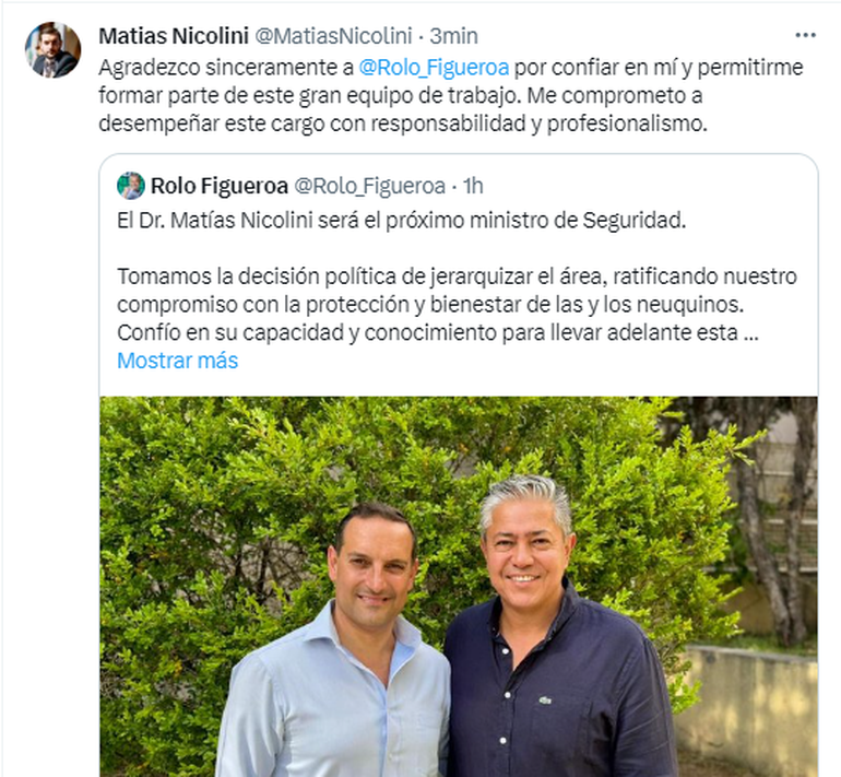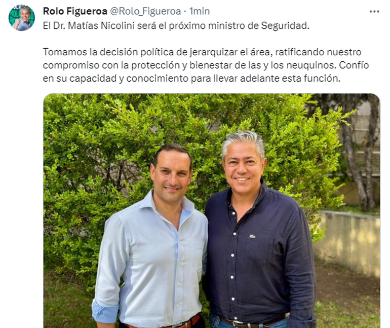 A través de las redes sociales, Figueroa dijo que "tomamos la decisión política de jerarquizar el área, ratificando nuestro compromiso con la protección y bienestar de las y los neuquinos. Confío en su capacidad y conocimiento para llevar adelante esta función".