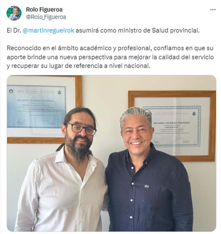 Este viernes por la tarde, por las redes sociales, Figueroa anunció que el doctor Martín Regueiro será el futuro ministro de Salud.