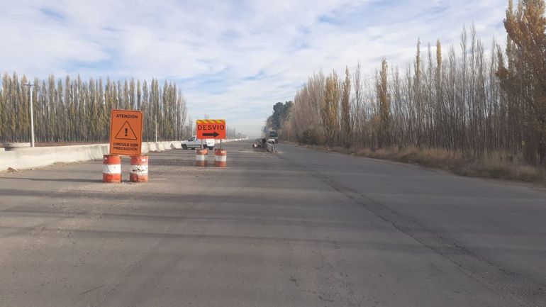 A corta distancia hay una serie de tambores anaranjados y blancos que cumplen la función de señales que contienen dos carteles. Uno anuncia que está el desvío y el otro advierte “Atención circule con precaución”.