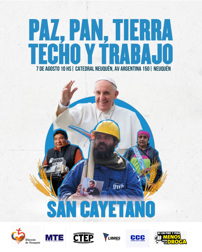 Se realizará una concentración para honrar a San Cayetano en Neuquén capital este jueves. Organizaciones sociales y gremiales de la mano de la diócesis de la provincia convocan en la catedral bajo la consigna "pan, paz, tierra, techo y trabajo".