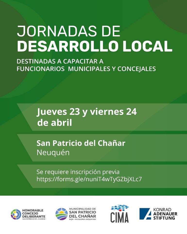 El Centro de Investigaciones Municipales Aplicadas (CIMA), la Fundación Konrad Adenauer, el Municipio de San Patricio del Chañar y el Concejo Deliberante, organizarán el 23 y 24 de abril las Jornadas de Desarrollo Local. Se trata de la décimo quinta edición de este encuentro sobre políticas públicas locales, que se viene realizando desde hace ya varios años en distintas ciudades de nuestro país.