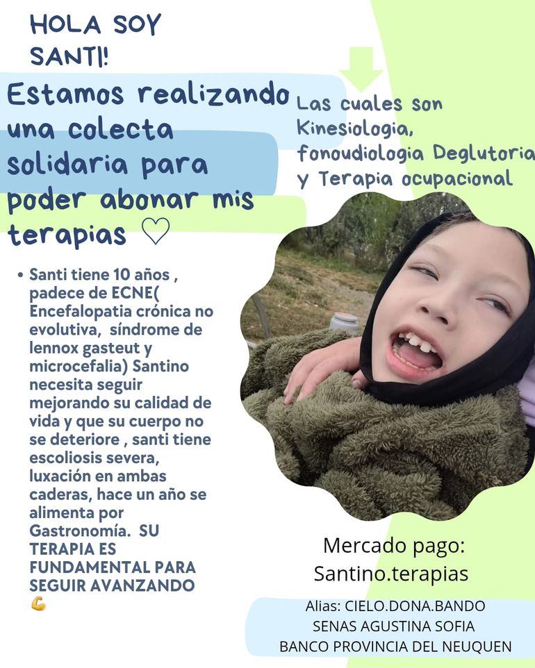 Aclaró que Santino no cuenta con obra social y solo recibe una pensión por discapacidad de $280.000, más una ayuda social de Provincia que todavía no alcanza los $200.000. "Solo contamos con eso", enfatizó Agustina.