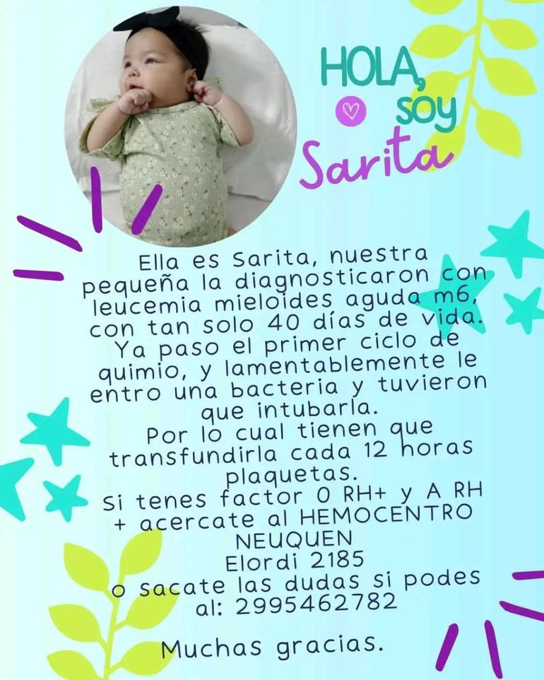 Tras determinar qué tipo de leucemia tenía la pequeña se dio comienzo al primer ciclo de quimioterapia. “A los días de haber terminado le agarró una infección y al estar tan cansado su cuerpo decidieron intubarla de urgencia. Con esto crece la necesidad de transfusiones de glóbulos rojos y plaquetas cada 12 horas”, aseveró Eliana. Añadió que “el Hemocentro nos pidió donadores de plaquetas el día de la intubación y nosotros hicimos una imagen que trascendió todo Neuquén. Ahora esperamos que la gente pueda ir a donar no solo por Sarita, sino que también por todos los nenes que tienen leucemia y lo necesitan”.