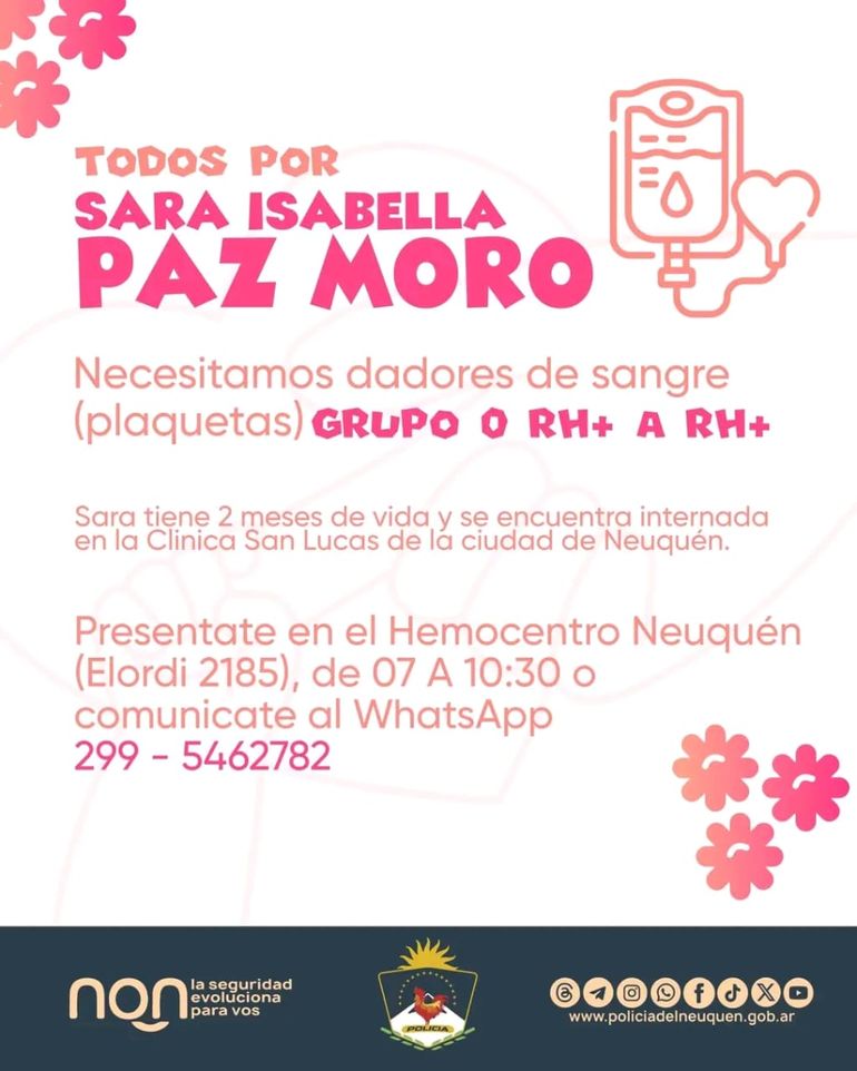 A raíz de este contratiempo y de necesidad urgente, la familia ha efectuado un fuerte llamado a la solidaridad de los vecinos de la capital neuquina para lograr la donación de plaquetas. Al respecto, informó que “necesitamos dadores de sangre (plaquetas) GRUPO O RH+ A RH+. Quienes deseen colaborar se pueden presentar en el Hemocentro Neuquén (Elordi 2185), de 7 A 10:30 horas o bien comunicarse a la línea del WhatsApp 2995462782 para recibir más información”.