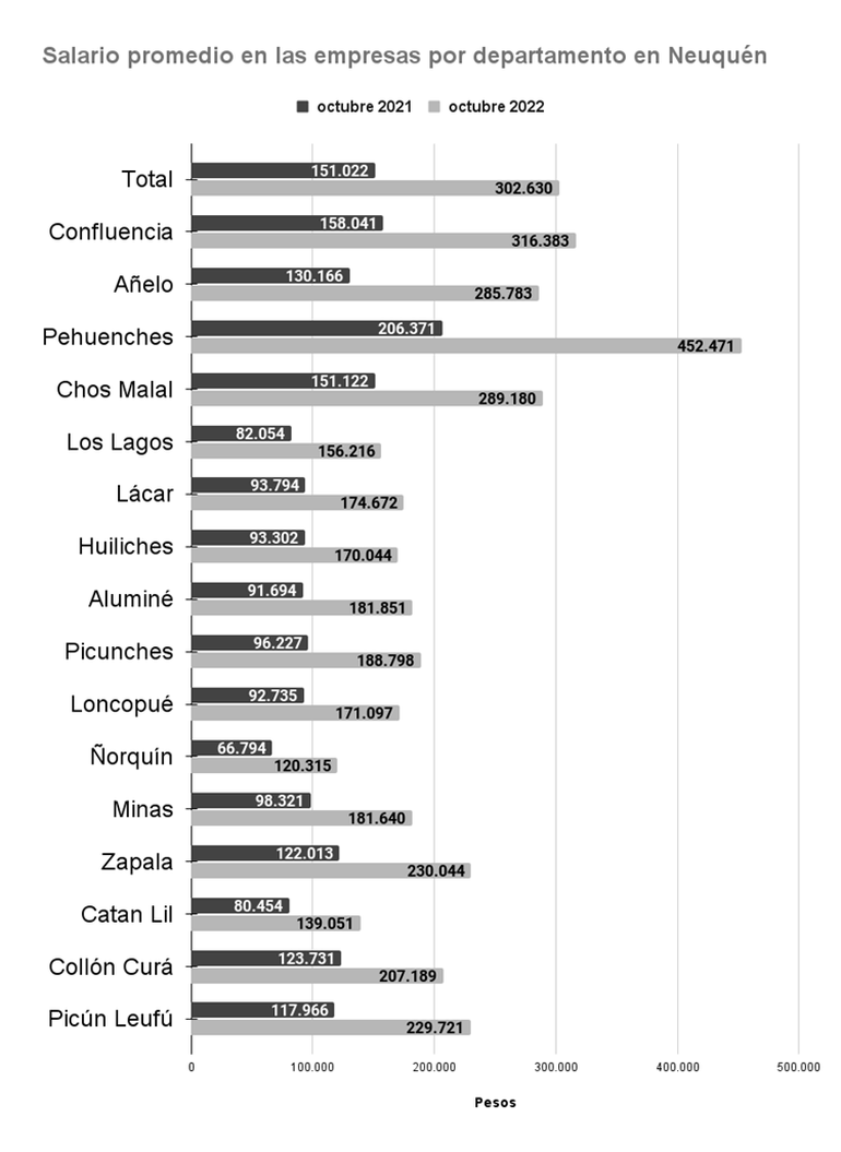 La brecha salarial entre los trabajadores de las empresas de la zona petrolera con los de la zona turística se agrandó entre fines de 2021 y la misma época de 2022. El sueldo promedio de los empleados formales de las empresas de Pehuenches y Añelo creció casi 120 por ciento entre los últimos dos octubres, al mismo tiempo que en Los Lagos lo hizo un 90 por ciento y en Lácar, un 86 por ciento.