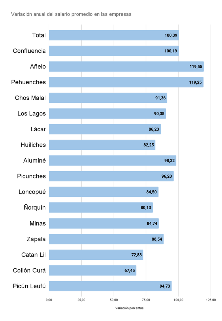 En Chos Malal el salario promedio de las empresas creció 91 por ciento en un año, diez puntos menos que a nivel provincial y casi 30 puntos por debajo del crecimiento en Pehuenches y el Añelo. Así y todo, el promedio salarial de los empleados por las empresas de Chos Mala está entre los más altos de la provincia. En octubre fue de 289.280 pesos, superado sólo en Pehuenches y Confluencia.
