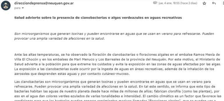 Sin embargo, tal comentario no era ni es cierto, ya que la Autoridad Interjurisdiccional de Cuencas (AIC) solo emitió una alerta temprana ante la floración de algas para el lago Ramos Mexía (El Chocón), principalmente como prevención de aquellos vecinos y turistas que utilizan algunos sectores para el entretenimiento típico en esta temporada estival.