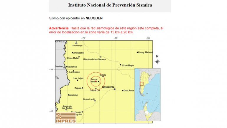 El epicentro del sismo se localizó a unos 110 kilómetros al noroeste de Neuquén; a 415 kilómetros al oeste de Santa Rosa, capital de La Pampa; a 80 kilómetros al sur de de Rincón De Los Sauces.