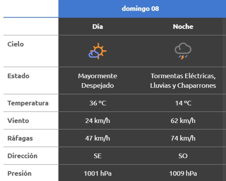 Hacia la noche, la temperatura descenderá abruptamente en torno a los 15 grados, y las ráfagas de viento que irán rotando del sudeste al sudoeste, pueden alcanzar los 76km/h en horas de la noche. Con este panorama, el pronóstico de la autoridad de cuencas indica serias probabilidades de lluvias y tormentas eléctricas.