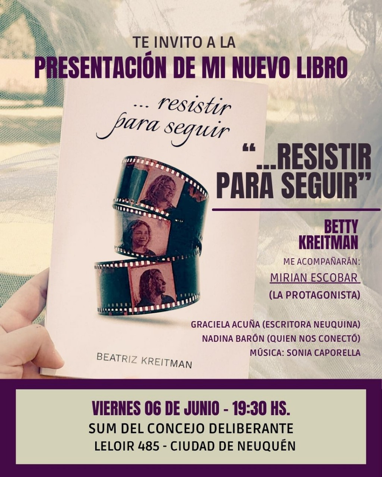 Por otra parte, el viernes 6 de junio a las 19.30 en el SUM del Concejo Deliberante de Neuquén, ubicado en Leloir 485, se presentará el libro Resistir para seguir de la exdiputada Betty Kreitman. El libro, según su autora:"Intenta ser un aporte a la construcción de la memoria feminista y la lucha de las mujeres contra la discriminación y el camino de un permanente resistir para seguir y reinventarse".