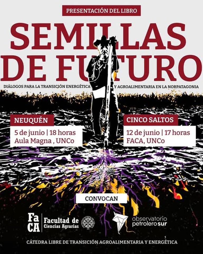 El primer evento será el jueves 5 de junio a las 18 en el Aula Magna de la UNCo (Buenos Aires 1400), de la localidad de Neuquén Capital. Se trata de la presentación del libro Semillas de futuro. Diálogos para la transición energética y agroalimentaria en la Norpatagonia, una publicación coordinada por el sociólogo e investigador del CONICET Diego Pérez Roig.