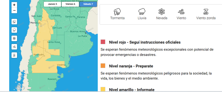 El SMN emitió una alerta amarilla por tormentas para este sábado. El fenómenos comprenderá la capital neuquina y parte del norte y centro de la provincia. Puntualmente, indicó que se verán afectados: Confluencia, Este de Añelo, Este de Pehuenches, Picún Leufú, Este de Loncopué, Este de Picunches, Este de Ñorquín, Oeste de Añelo, Oeste de Pehuenches, Sur de Chos Malal y Sur de Minas.
