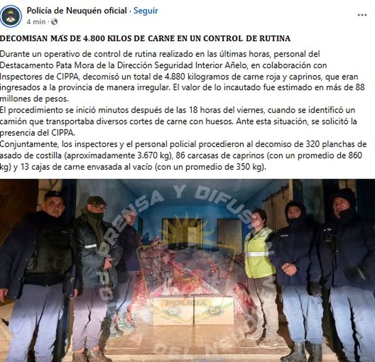 El comisario inspector, al frente de la Dirección Seguridad Añelo, Felix Carporaso, confirmó el secuestro a LMNeuquén y dio más detalles del caso: "Ocurrió el viernes, a las 18.30, en el puesto de Pata Mora, por ruta 180. Allí, el personal identificó un camión Iveco que procedía de La Pampa y le pidió al conductor la documentación, la cual estaba en regla. Sin embargo, en la inspección, constató que llevaba carne con hueso".