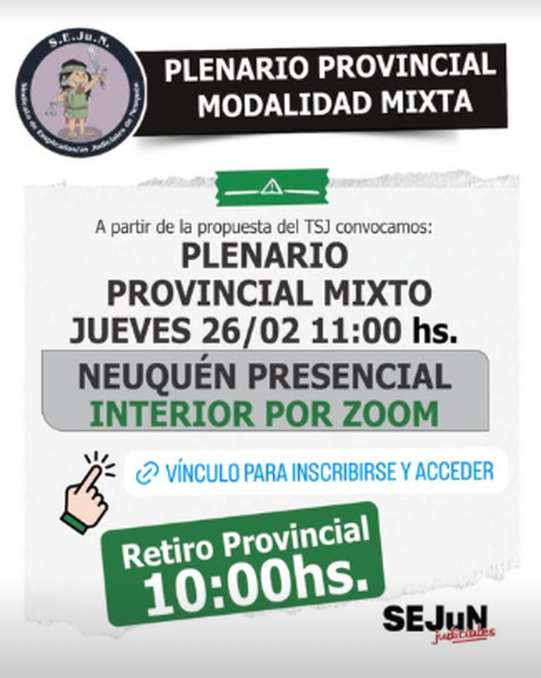 En este marco, la conducción sindical convocó a participar "masivamente" del plenario provincial que se realizará este jueves 26 de febrero, con modalidad mixta: "presencial en la sede sindical para las y los trabajadores de Neuquén Capital y virtual para las y los compañeros del interior de la provincia", afirmaron.