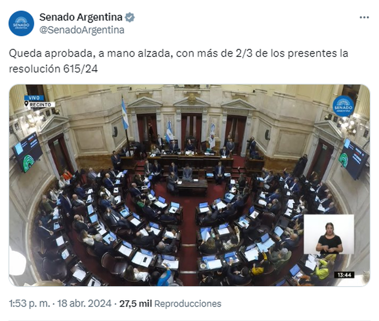 La medida contó con el respaldo de la mayoría de los senadores, salvo los representantes del PRO, de La Libertad Avanza y los radicales Rodolfo Suárez y Mariana Juri.