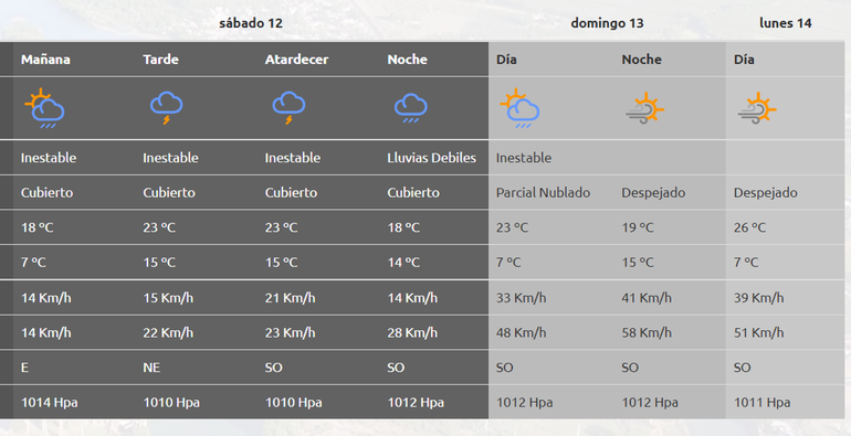 En tal sentido, el pronóstico de la Autoridad Interjurisdiccional de Cuencas (AIC), indica que este sábado el tiempo seguirá inestable con una temperatura máxima que rondará los 23°C. En tanto, el domingo las condiciones mejorarían con cielo parcialmente nublado, pero sobre horas de la noche se haría presente el viento suroeste con ráfagas de hasta 58 kilómetros por hora. El lunes, la temperatura iría en descenso -26°C de máxima-.
