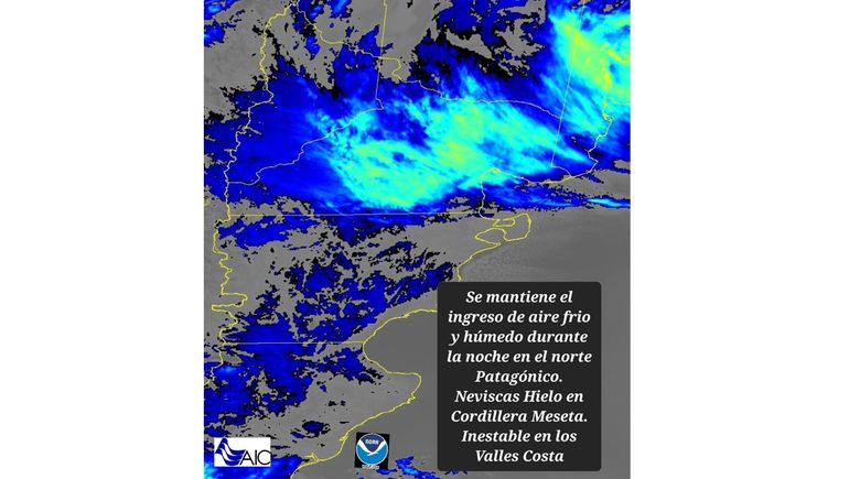 La Autoridad Interjurisdiccional de las Cuencas (AIC) advirtió que para este martes continúa el ingreso de aire frío y húmedo en el norte de la Patagonia. Prevé neviscas, hielo en cordillera y meseta mientras que estará inestable en valles y costa. Pronosticó para este martes vientos del sudeste en superficie con aumento de la probabilidad de lluvias.