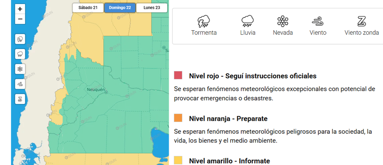 Nuevamente el SMN emitió una alerta amarilla por nevadas que se extenderá desde el extremo sur hasta el norte neuquino cordillerano. Explicaron que esa alerta refiere a "posibles fenómenos meteorológicos con capacidad de daño y riesgo de interrupción momentánea de actividades cotidiana". También que el área se verá afectada por nevadas persistentes de variada intensidad. Adelantaron que, en estos casos, "se esperan valores de nieve acumulada entre 10 y 20 cm, pudiendo ser superados en forma puntual".