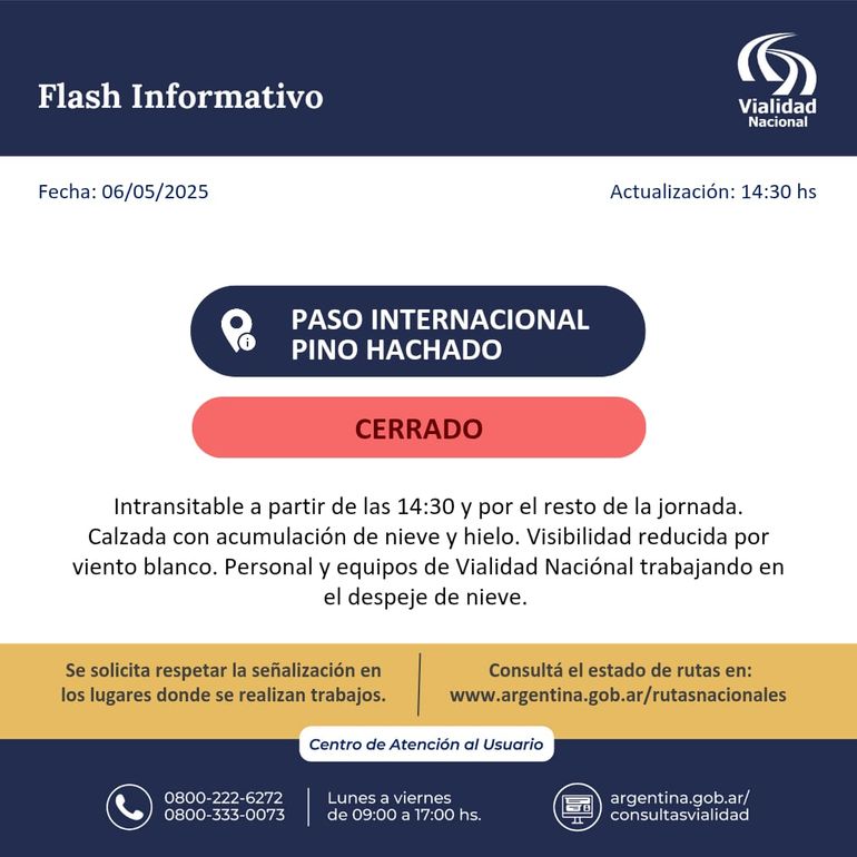 El Paso Internacional Pino Hachado que une Neuquén con Chile, quedó cerrado este martes desde las 14:30 por tener la ruta intransitable. Vialidad Nacional confirmó que la calzada tiene acumulación de nieve y hielo y que la visibilidad está reducida por viento blanco. No volverá a abrir durante esta jornada.