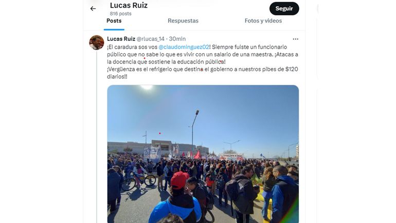 El político neuquino salió al cruce de las declaraciones del legislador del MPN al señalar: “¡El caradura sos vos @claudominguez02! Siempre fuiste un funcionario público que no sabe lo que es vivir con un salario de una maestra”. Y arremetió: “¡Atacas a la docencia que sostiene la educación pública! ¡Vergüenza es el refrigerio que destina el gobierno a nuestros pibes de $120 diarios!!”