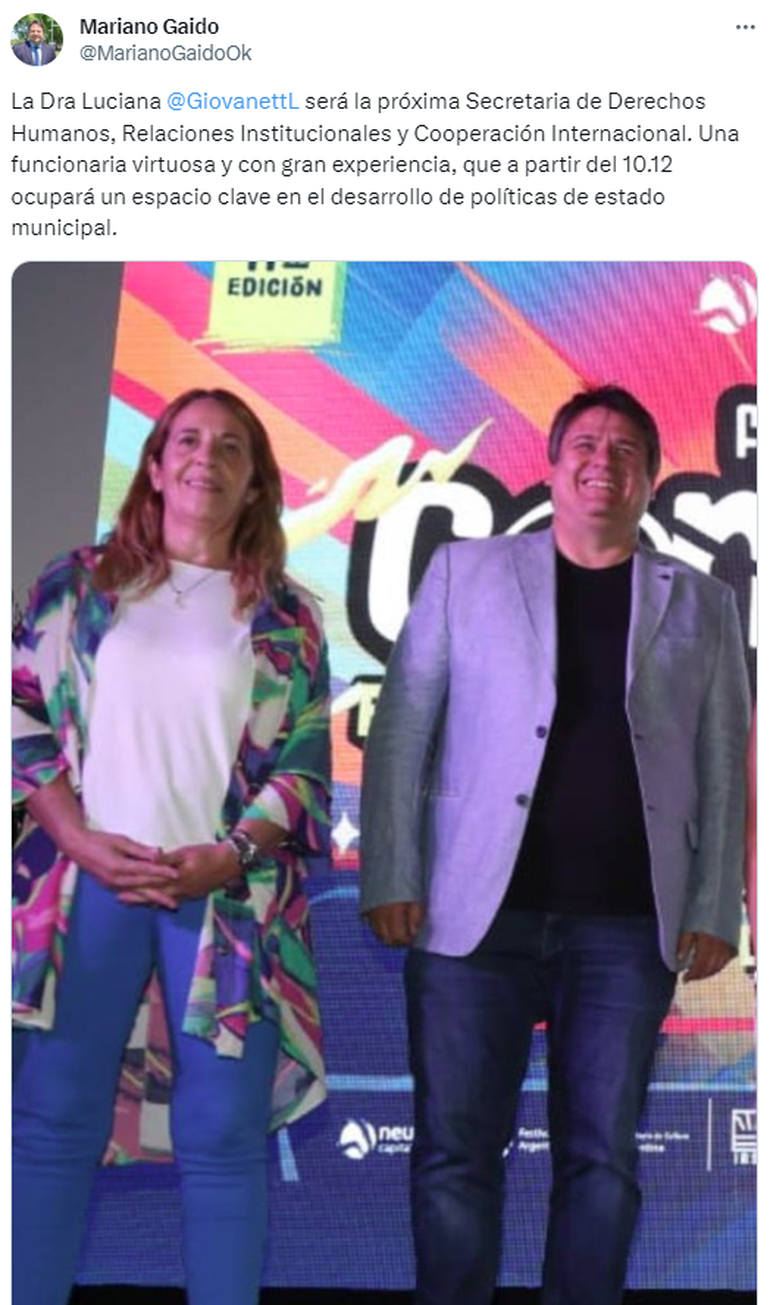 Gaido adelantó que la funcionaria municipal, desde el próximo mes, al asumir el segundo período, será la titular de la flamante secretaria de Derechos Humanos, Relaciones Institucionales y Cooperación Internacional.