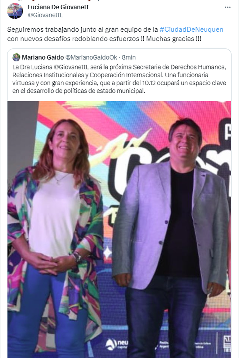Conocido el anuncio, la propia De Giovanetti replicó el posteo y destacó que "seguiremos trabajando junto al gran equipo de la ciudad de Neuquén con nuevos desafíos redoblando esfuerzos".