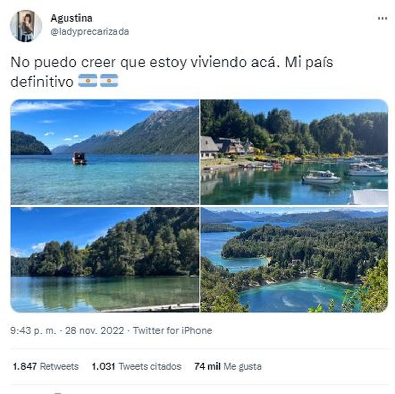 "No puedo creer que estoy viviendo acá. Mi país definitivo", publicó Agustina, una activa usuaria de Twitter que comparte en la red social impresiones de su vida cotidiana y algunas pinceladas de su nueva rutina en Villa La Angostura, adonde se mudó desde Buenos Aires. La belleza de los paisajes que fotografió es tan evidente que la publicación se hizo viral en pocos minutos.