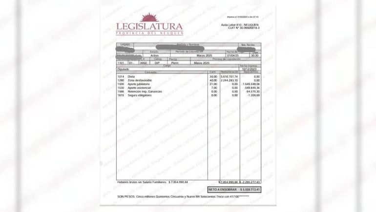 LMNeuquén accedió al recibo de sueldo de un legislador de la provincia, que representa el escalafón más alto dentro de la estructura de la Legislatura de Neuquén. Según consta en el recibo, su dieta es de 5.610.707 pesos, a lo que se añade también el adicional del 40% por vivir en una zona desfavorable. Es decir, otros 2.244.283 pesos.