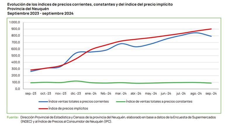 La referencia a septiembre se debe a que es el último mes con datos oficiales del órgano de Estadísticas y Censos de la provincia sobre el desempeño del comercio supermercadista radicado en Neuquén. El informe de la repartición provincial es más completo que apartado sobre Neuquén que contempla la medición nacional de los supermercados a cargo del INDEC.