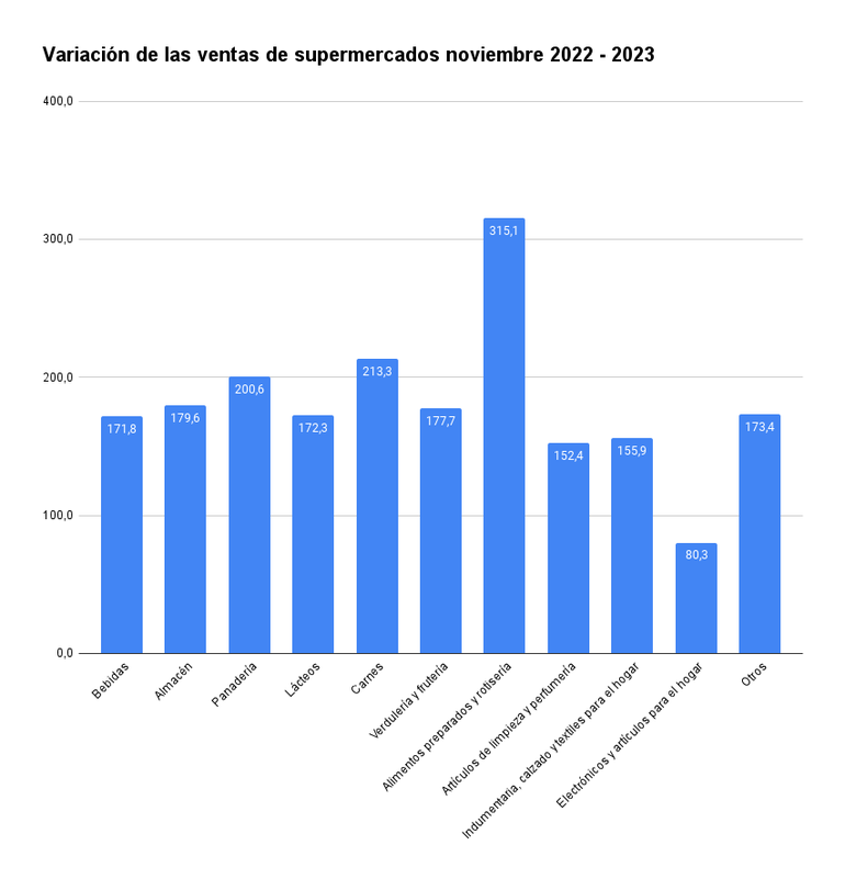 Mientras las ventas totales crecieron en pesos corrientes en torno al 170 por ciento, las ventas por habitante de la provincia lo hicieron en el orden del 160 por ciento. En noviembre del 2023, los supermercados facturaron 42.443 pesos por habitante.