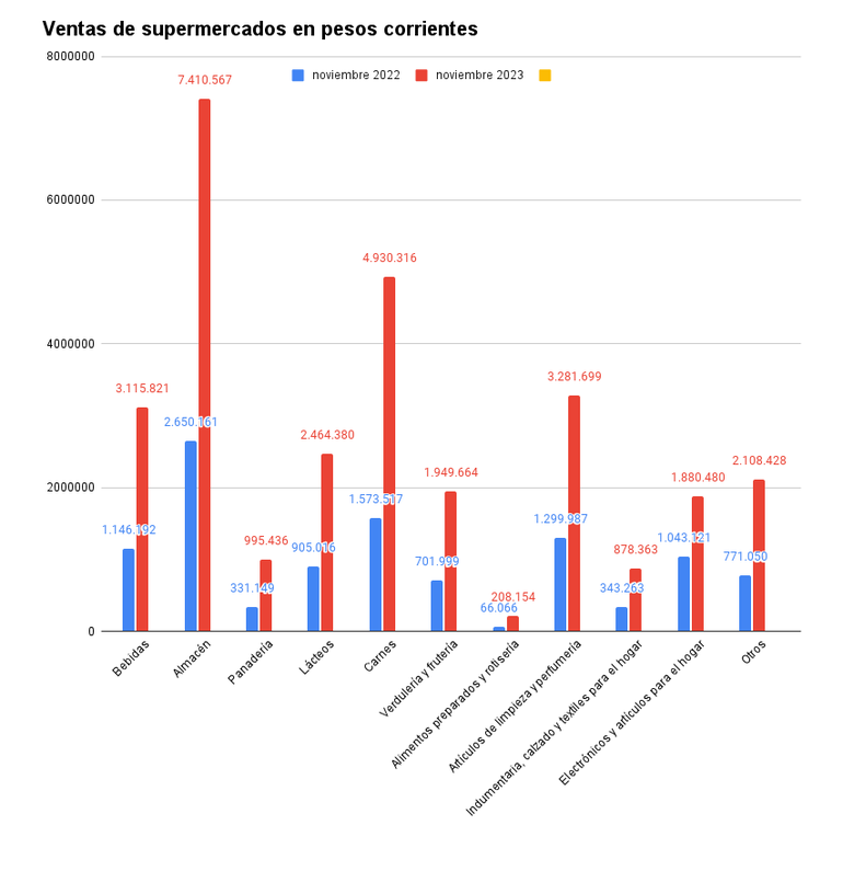 La medición del INDEC de las ventas por rubros en los supermercados recién informó los resultados de noviembre del año pasado. Las ventas en general ya están planchadas entonces en comparación con las de un año antes. El informe del INDEC difundido ahora contempla las ventas en pesos corrientes, sin contemplar el efecto de la inflación.