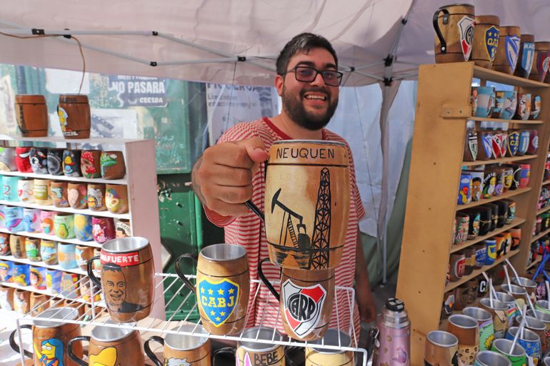 En su stand se pueden encontrar desde mates con guitarras para los amantes de la música, hasta diseños inspirados en Los Simpson y emblemas regionales como una torre de perforación de petróleo o el escudo de la UNCO. “La idea es que si querés regalar algo, encuentres uno que tenga que ver con la persona. Vamos variando y creando todo el tiempo”, aseguró.