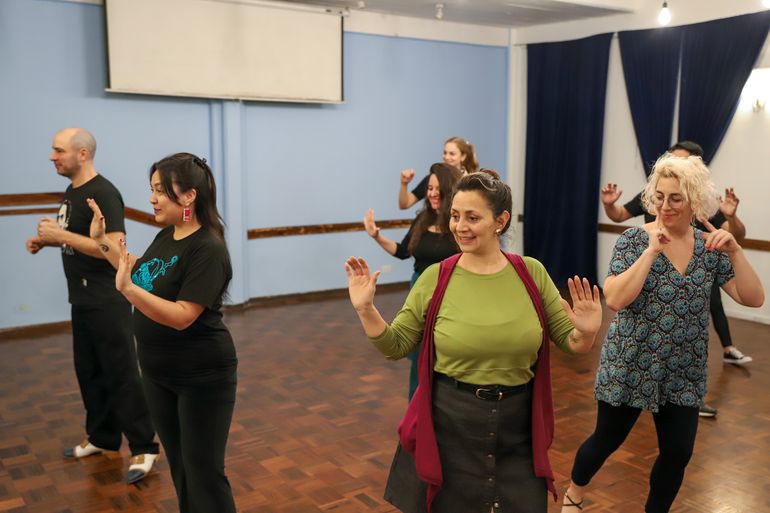 Laura se para en medio de la pista y empieza a mover la punta de los pies en círculos para calentar los tobillos. Va repasando con todos lo que llaman los 5 elementos fundamentales para moverse junto a otro: saber en qué pie se está parado y el cambio de peso; pivot, pasó adelante, atrás y laterales; el abrazo; y la percepción de la pareja y quienes bailan al lado. “Si consideramos estos elementos, vamos a estar bailando tango”, dice entusiasta. “El tango desarrolla los sentidos que tenemos olvidados, despierta la sensopercepción, no sólo por lo que implica bailar en pareja, sino porque es un baile esencialmente social, no es de academia, sino un baile popular donde compartimos espacio entre muchos”, agrega Julián.