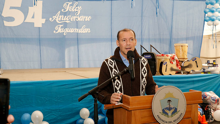 El gobernador Omar Gutiérrez presidió este martes por la mañana los festejos por el 54º aniversario de Taquimilán, donde dejo inaugurado el tótem de acceso a la localidad, recorrió el avance de la obra del acueducto y anunció que en agosto estarán listas las refacciones en el aeropuerto de Chos Malal, de gran importancia para la conectividad de todo el norte de la provincia.